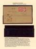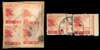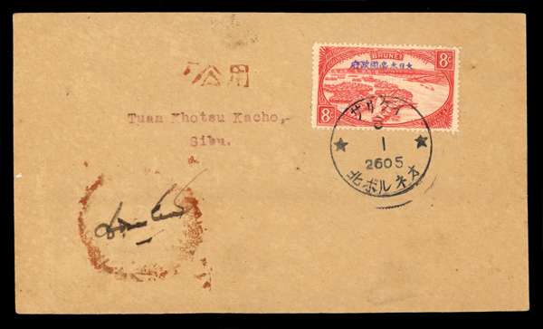 Group of four pieces from Sarikei to Sibu, variously bearing Japan 2s and 4s stamps or Brunei 1942-44 8c red (= SG J10), tied by fine to very fine strikes of Sarikei type JD3 ‘Japanese’ cds; a fine and interesting range, clearly showing different types of cancel, most noticeably in the size of the stars at the sides. Also Japan 10s (2 + 4) showing two part strikes of the same cancel.