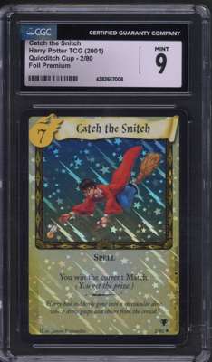 The lot features the premium foil Catch The Snitch from the Harry Potter Quidditch Cup expansion, the second Harry Potter set to be released in 2001. The card has been authenticated and graded by CGC and awarded a 9.