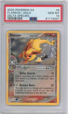 This lot features a Holo Flareon from the 2005 Delta Species expansion graded a perfect PSA 10.