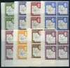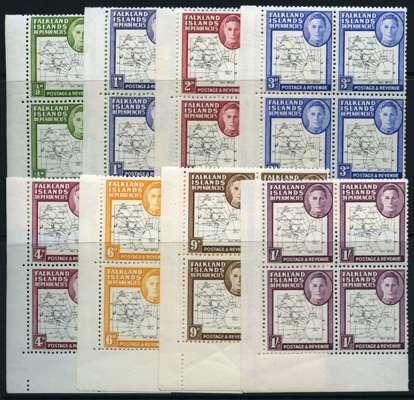 1948 Thin Map set less 2½d value in mint corner blocks of four, R5/2 in each block with dot on 'T', the lower pairs u/m. The 2½d does not come with this variety. SG G9, b - G16, a, cat £542