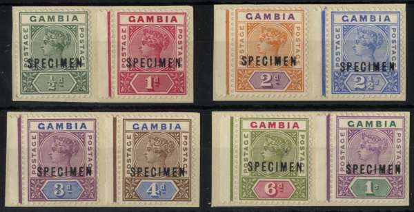 1898 set of eight overprinted SPECIMEN Type D12, matched left marginal examples, affixed to four pieces of stout paper by the receiving authority. SG 37s-44s, cat £200