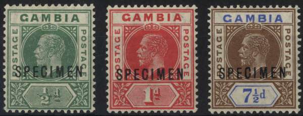 1921 Script watermark ½d, 1d and 7½d values with large part o.g., overprinted SPECIMEN Type D12, each with #41 variety...