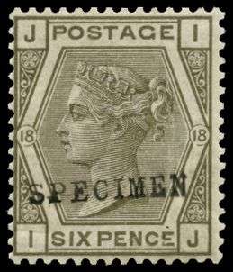 1882 6d Grey Pl.18. Very fine unmounted o.g. example lettered IJ, overprinted "SPECIMEN" type 9. Spec...