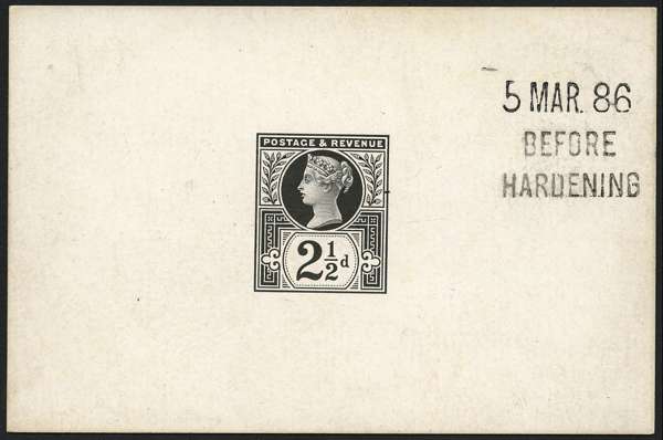 1886 21/2d "Jubilee" Die proof. Very fine die proof printed in black on white glazed card (92 x 60mm) endorsed "BEFORE HARDENING" and dated "5 Mar 86". Scarce. Ex. "Aureum".