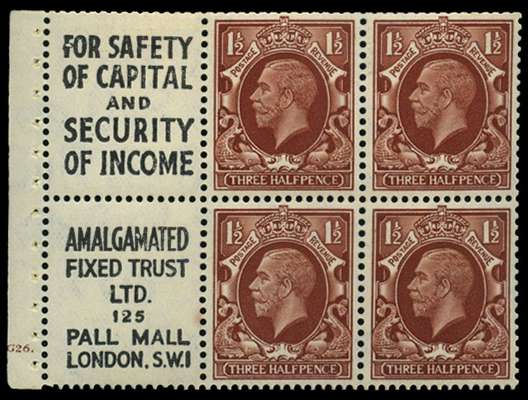 1935 1½d Booklet pane with advertising labels (Wmk. Upright, Perf type B4A(I)). Very fine unmounted o.g. G26. cylinder pane showing adverts "For Safety of Capital/Amalgamated Fixed Trust". Spec. NB27(8).