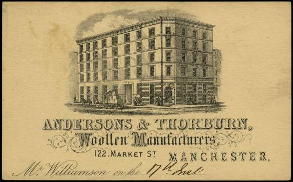 ADVERTISING: ½d brown postal stationery card neatly ties by Manchester duplex for "JU 12/78", the reverse advertising "ANDERSONS & THORBURN,/Woollen Manutacturers,/122 Market St./MANCHESTER.". Fine and most attractive