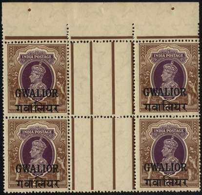 Gwalior. 1948 2r purple and brown interpanneau block of four from the top of the sheet, u/m. Stamps centred right and gum somewhat dark, good appearance. SG 113, cat £100