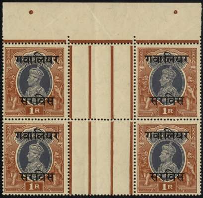 Gwalior Officials. 1942 1r grey and red-brown interpanneau block of four from the top of the sheet, lightly folded...