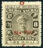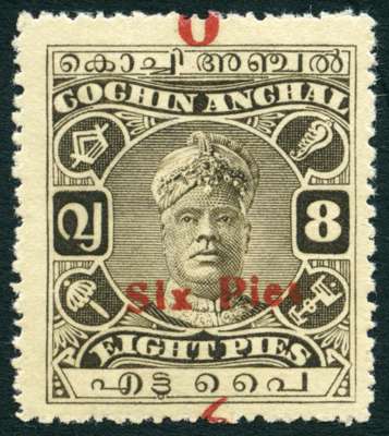 Cochin. 1934 6p on 8a sepia u/m, showing the surcharge shifted so that the '6' is split between the top of the stamp and...