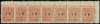 1921 1c on 4ca pink upper right corner horizintal strip of seven, the top perfs dramatically misplaced 1cm upwards, creating the appearance of being imperforate between stamps and top margin, fresh o.g. Spectacular. SG 31 var