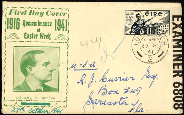 1941 2½d Easter Rising Volunteer used with Limerick CDS 27 X 41 (First Day) sent to Florida, censor tape applied on arrival. Printed design with portrait of Padraig Pearse, with the date 12 APR 1941 below altered in manuscript to 27th October. Evidently a complimentary offering from a Limerick stamp dealer named Alf McGann, since it contains a card with Christmas wishes and his contact details. Neatly opened at left side. SG 128