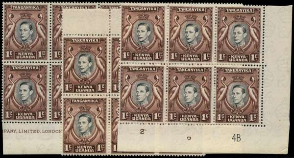 1938-54 1c 'South African Crowned Cranes' three multiples comprising lower marginal block of ten (2 x 5) showing plate '2' and '4A' the upper left stamp Retouched value tablet, pos 9/6, upper marginal block of six (3 x 2) the middle stamp of the lower row with Break in birds breast, pos 2/5, and lower right corner marginal block of six (3 x 2) showing plate '2' and '4B' the lower left stamp with the 'Tadpole' flaw, pos. 10/8, the stamps all fresh and fine u/m, an attractive trio