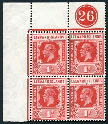 1929 1d bright scarlet TL corner block of four with Plate 26, u/m, tiny selvedge corner crease. Difficult proving multiple. SG 62, cat £72