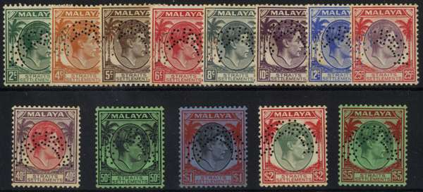 Straits Settlements. 1937-8 definitives 2ct - $5 (thirteen) less the 1ct, 30ct and later values perforated SPECIMEN Type...