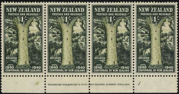 1940 Centennial 1/- bottom marginal strip of four with imprint and Plate A1 mounted mint, gum disturbance at base just affecting one stamp. SG 625 (CP S38a, $400 for unmounted imprint strip)