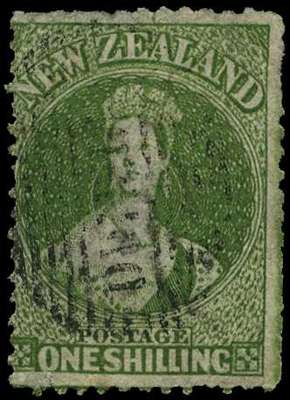 1862-63 1s deep green, pelure paper, perf 13 cancelled by part Dunedin in bars, perfs stripped lower right, used SG 94, cat £2000