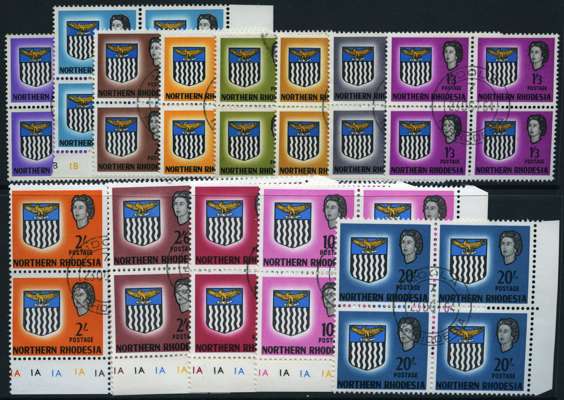 1963 set less 4d green in used blocks of four, CTO'd Ndola 23 OC 64. 1d and 2/- to 10/- Cylinder blocks. SG 75-8, 80-8,...