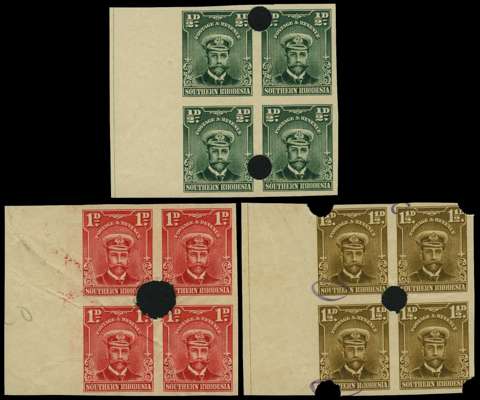 1924-29 plate proofs, imperforate and ungummed of ½d blue-green, 1d bright rose and 1½d bistre-brown, each in a left marginal block of four with punch holes, 1½d with pen marks indicating the plate flaws to be corrected. 1d some creasing otherwise fine. SG 1/3 var