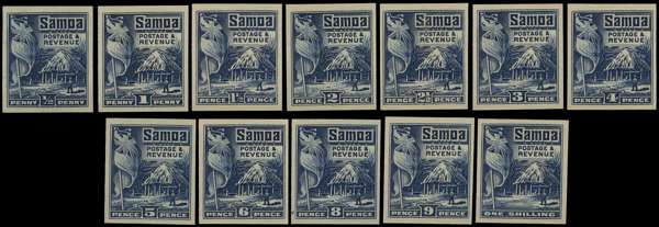1921 'Hut' set of twelve to 1s imperforate plate proof singles in indigo on unwmked wove paper, printed by Bradbury Wilkinson before the plates were dispatched to New Zealand. A fine and unusual set. SG 153-164var