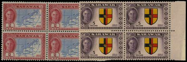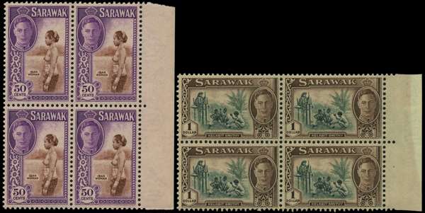 1950 part set of four values, 50c brown and violet, $1 green and chocolate, $2 blue and carmine and $5 black, yellow, red and purple as marginal blocks of four, full unmounted o.g. small tone speck to $5, otherwise fine with fresh appearance. SG 182-185, £460+