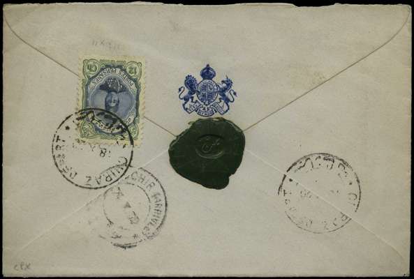 1920 Soldiers letter addressed to Edinburgh endorsed 'On Field Service' and signed by the commanding officer at lower left, franked on reverse by 1911 12ch blue and green cancelled by Chiraz Depart cds for 18 X 20, with Bushire transit marks, most attractive and scarce cover. SG 370