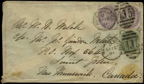 1881 cover to New Brunswick, Canada franked by 1880 ½d pale-green and Postal Fiscals 1d purple (Die IV) (2), tied by Kidderminster duplex's for SP 12 81, backstamped by St John.N.B Canada arrival d/s for SP 26 81, peripheral wear, otherwise a scarce item. SG 165, F23