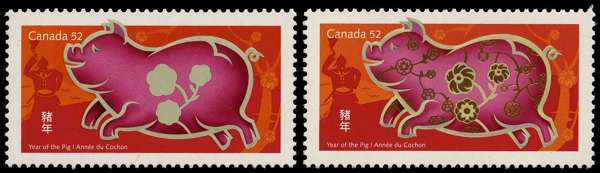 2007 Chinese Year of the Pig 52c, variety 'GOLD (FLOWERS) OMITTED' with normal for comparison. Fine unmounted og. SG 2478a, £100