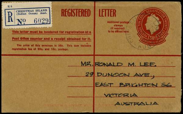 POSTAL STATIONERY: QEII 30c red on buff embossed registered envelope addressed to Australia tied by neat single-ring 'Christmas Island/INDIAN/-5 FE 63/OCEAN/AUST' ds and blue on white registration label at top left, the reverse with Melbourne transit and Brighton easy arrival ds. Fine and attractive