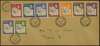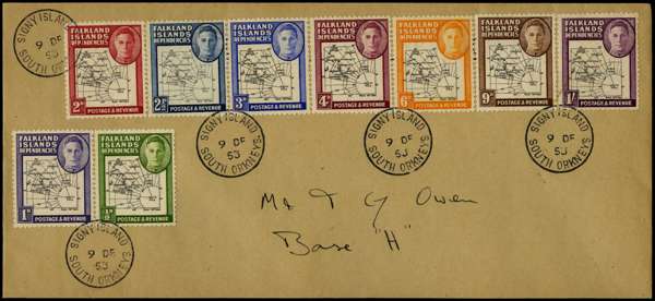 1946 Thick Map set of eight plus Thin Map 2½d on 9" x 4" envelope, Signy Island CDSs of 9 DE 52. The ½d with Pl. 1 R3/9 extra island. SG G1aa