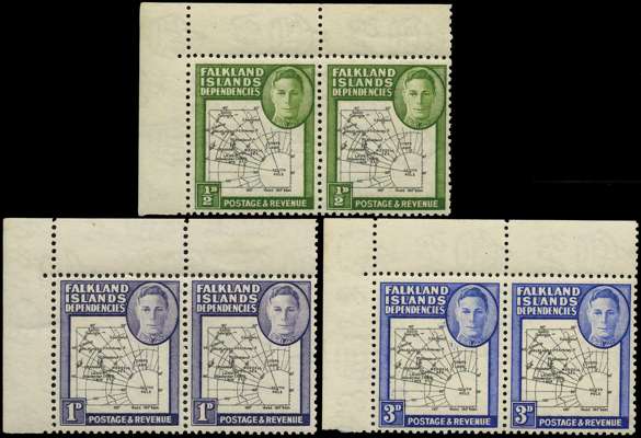 1946 Thick Map ½d, 1d and 3d top left corner pairs, each with R1/2 missing 'S', o.g. with the stamps unmounted. SG G1b, 2b, 4b, £695