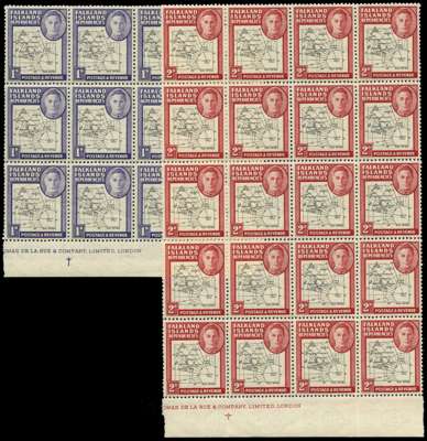 1946 Thick Map 1d and 2d multiples, each with large part imprint and Plate 1 R.4/5 extra dot by oval, unmounted o.g. The 1d a block of twelve, with some slightly foxed on reverse, the variety with some blunt perfs at top; the 2d a block of twenty with two normals foxed on reverse, top row separating. SG G2d, G3d, £555+