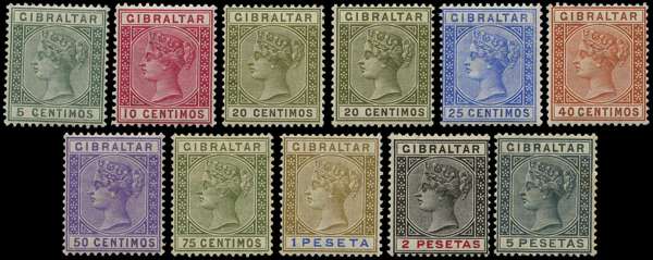 1889-96 set less 1p bistre, o.g., mainly fine but the 20ct olive green with a faint foxed spot and the 5p with a larger foxed spot. SG 22-33 (less 30)