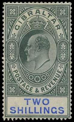 1903 2/- green and blue, watermark Crown CA, fresh mint with good unrubbed colour; with o.g. but with hinged area rather extensive. SG 52, £200