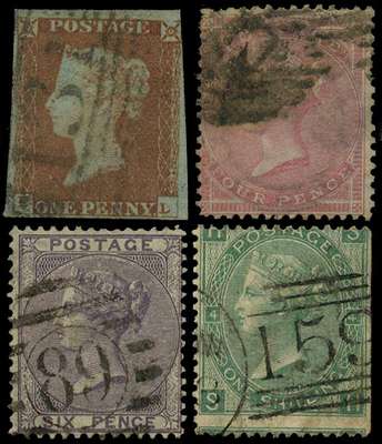 1841-65 1d red-brown, 4d pale carmine, 6d pale lilac and 1s green, used all with INVERTED WATERMARK, mixed condition, 1s with trimmed perfs at right, otherwise a useful lot. SG 8-101wi, STC £2650