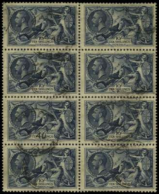 1934 Re-Engraved 10s indigo, block of eight (4x2), used cancelled by indistinct cds, slight creasing as nearly always seen, otherwise a scarce multiple. SG 452, £640+