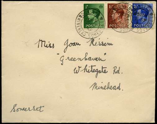 1936 KEVIII ½d, 1½d and 2½d on neat, hand-addressed cover cancelled by Dunster, Somerset "1 SP/36" cds, the first day of issue. SG 457, 459, 460 £175