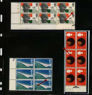 QEII varieties, including 1967 4d Discovery broken scale, 1969 Ghandi tooth flaw and 1969 4d Concorde oil slick, all in positional blocks of 6, fine unmounted o.g. SG 752a, 807a, 785var, £85