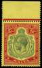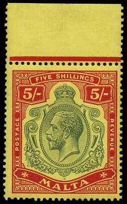 1917 5/- green and red on yellow paper top marginal, lightly hinged on the selvedge only leaving the stamp unmounted; perfs at the right on the reverse slightly darker than ideal. SG 88, £100