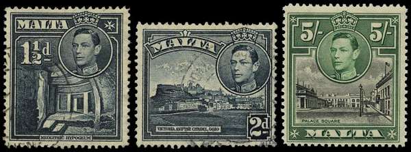 1938 set varieties comprising 1½d slate-black used with R5/7 RP broken cross, 2d slate-black used with R2/7 extra windows (short perfs at top, but scarce) and 5/- with R2/7 semaphore flaw, unmounted o.g. SG 220ba, 221a, 230a, £305