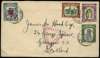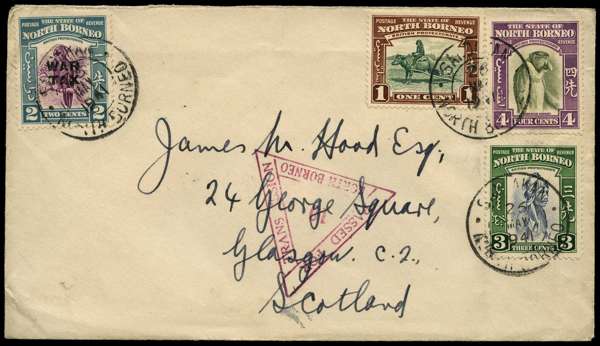 CENSORED MAIL: 1941 (25 May) envelope addressed to Scotland franked with 1939 1c, 3c, 4c and 1941 'WAR TAX' overprint 2c, all tied by Sandakhan double-ring ds, below purple 'PASSED FOR/TRANSMISSION/NORTH BORNEO/10' triangular censor marking. Fine and scarce. SG 303, 305/6, 319