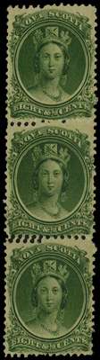 1860-63 8½ct yellow-green, yellowish paper vertical strip of three, showing partial double perforation at left, full unmounted o.g; an interesting item. SG15