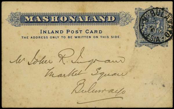1896 Matabele Rebellion 1d. postal stationary post card From J Bell Dutch Laager, Afrikander Corps addressed to Mr John R. Ingram, bearing fine strike from 'BULAWAYO RHODESIA' cds dated MY 17 96. Reverse bears rather humorous message, ''Dear Sir, Come and look us up in a day or so. Feel quite forgotten. Yours J Bell'' Minor age related wear nevertheless an fascinating piece of internal mail during the Rebellion.