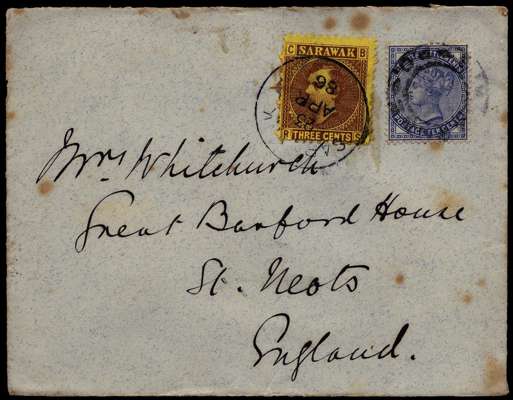 1886 combination cover to England bearing a Sarawak 1871 3c. brown/yellow cancelled by 'SARAWAK 23 APR 1886' and a Straits Settlements 1882 10c. slate (SG53) tied by Singapore double concentric rings cancel; the reverse having the flap decorated with Bishops Mitre embossed crest and C.H.S&S. in purple, alongside 'Singapore AP 26' transit and 'ST. Neots MY 20' arrival cds, few toned spots otherwise fine, a very rare early cover