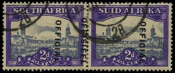 Officials. 1949 2d slate and bright violet used horizontal pair from a sheet with the overprint dramatically misplaced sideways and diagonally, showing the overprint transposed on the left stamp (OFFICIAL at left) and a single overprint (OFFICIAL) at right. Rare and spectacular. SG O36 var