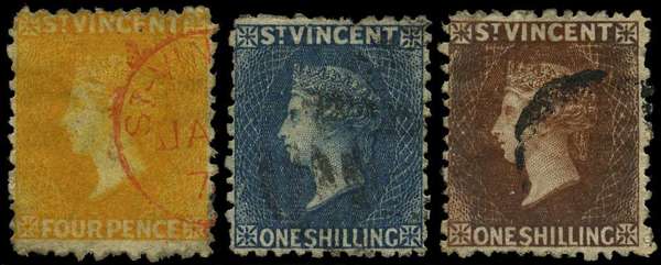 1869 4d yellow, 1/- indigo and 1/- brown, used. The 1/- lightly oxidised but a good trio. SG 12-14, £410