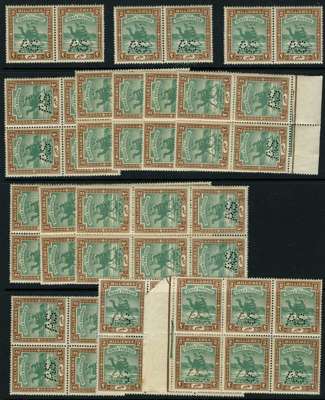 1913-22 2m green and brown, punctured "AS" type A4, 198 examples in pairs, blocks of 4 or larger, some with plate numbers the odd crease and tone spot, still generally fine u/m SG A18, cat £3,564