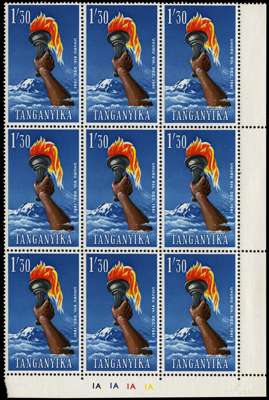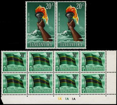 1961-64 unmounted mint selection of varieties comprising 10c, plate block of twenty-five, several stamps with retouches, 30c, plate block of eight, first with 'Flag Tie' flaw, 1s 30c, plate block of nine, two stamps with minor flaws and 20s, horizontal pair, right stamp with 'Mountain Flaw'. Fine. (44)