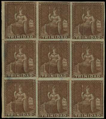 1851-55 (1d) purple brown block of nine mint unmounted/mounted (central top mounted, 8 stamps unmounted) with fresh o.g., Philatelic Foundation certificate (1980), very fine SG 2