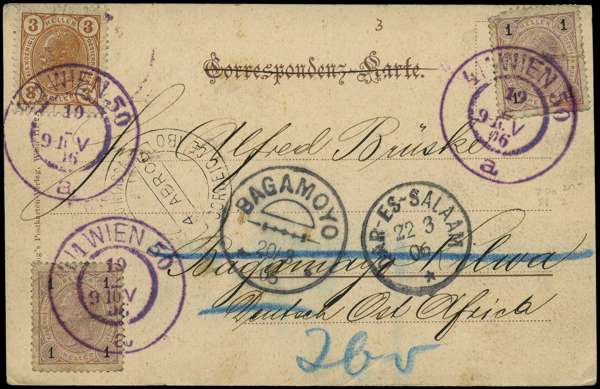 1870-1947 postal history selection of covers and post cards including; Barbados, Panama, France, Johore, Morocco Agencies and German East Africa, mixed condition, with mostly neat cancels, an interesting lot (8)