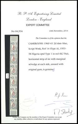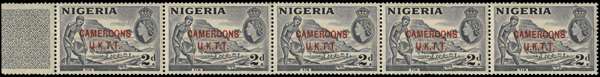 1960 Nigeria 2d slate-blue (Type A), overprinted "CAMEROONS U.K.T.T." in red, strip of five with left hand selvedge, two right hand stamps with small pen marks on reverse (one of these with a small gum wrinkle as well), the other three fine unmounted mint, BPA cert (2014) from when it was a strip of 6, SG T4a, Cat £5500
